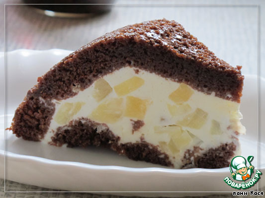 | Десерт как раз для жары - храниться должен в холодильнике, но не такой холодный, как мороженое. Творожная начинка, шоколадный корж и свежая черешня. |
