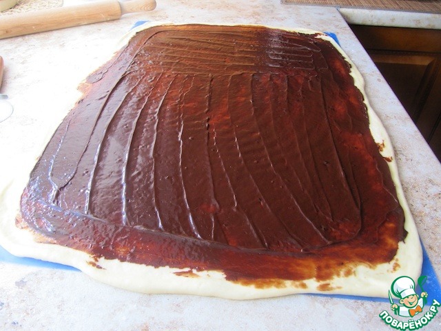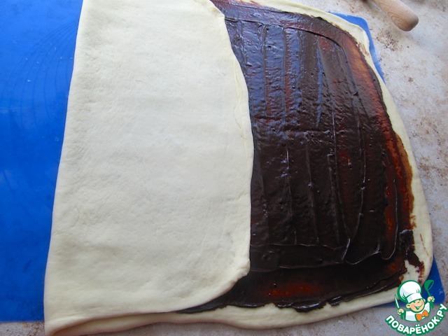 Смазать тонким слоем растопленного шоколада поверхность теста, оставив по краям по 5 -7 см (я оставила меньше, было труднее раскатывать!)