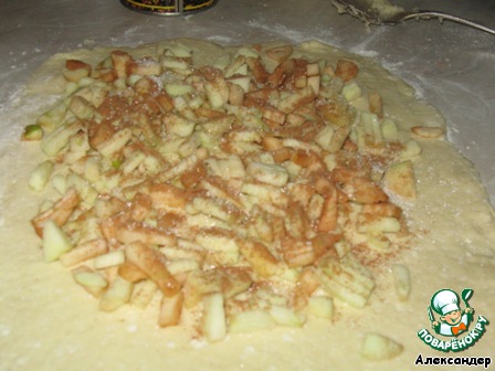 Выложить на тесто яблоки, присыпать их сахаром и корицей.