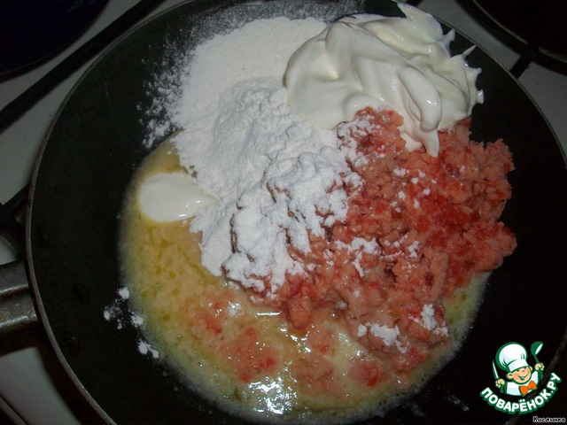 Выкладываем нашу массу на сковородку, туда же добавляем растопленное сливочное масло, муку (30 г = 1 ст.л.) и сметану.