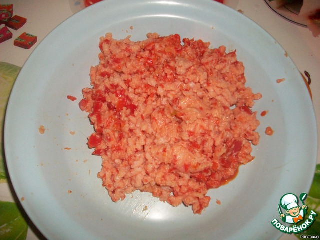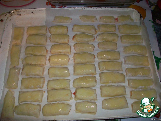 На противень стелим пергамент и выкладываем рулетики. Смазываем их желтком и отправляем в духовку, минут на 30.