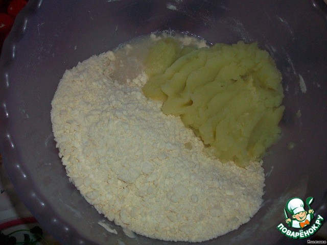 Из картошки делаем картофельное пюре и добавляем его к крошке, туда же добавляем дрожжи, разведённые в небольшом количестве воды.