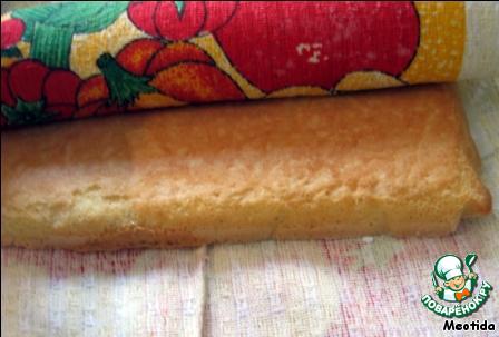 Снимаем бумагу, на которой он пекся, сворачиваем в рулет на кухонном полотенце и оставляем остывать.
