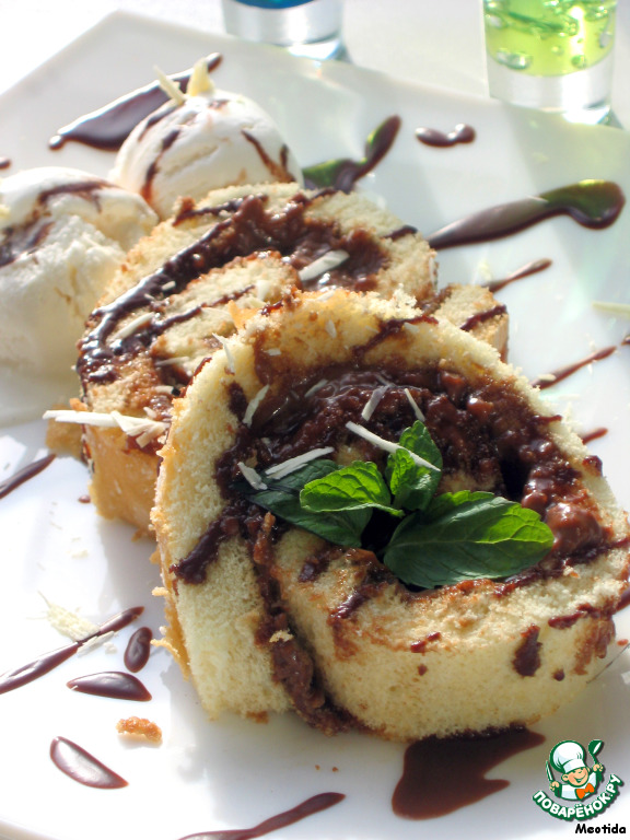| Рецепт заинтересовал меня тестом для коржа. Итог очень порадовал, даже превзошел все мои самые смелые ожидания, получилось очень воздушно, пористо и нежно. Крем можно взять любой, корж настолько хорош, что будет отлично гармонировать с чем угодно. Ну и, конечно, много шоколада на сервировочном блюде и шарики ванильного мороженого приятно оттеняют вкус и делают его завершенным. Рецепт этого блюда был размещен на сайте в 2008 году пользователем Настенька 90 /60 /90 под названием "Шоколадный рулет" и иллюстрирован мной в рамках акции «Раскраски». |