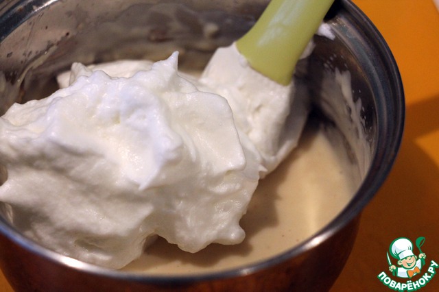 Потом аккуратно ввести желтки, соль и перец. Все немного взбить, добавить сыр и измельченный чеснок, перемешать и выложить в массу взбитые до устойчивых пиков белки. Аккуратно перемешать.