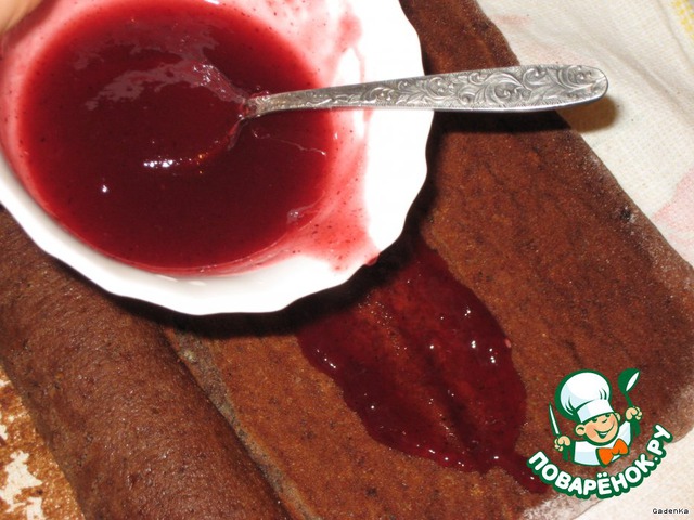 Остывший рулет развернуть, аккуратно убрать полотенце и смазать сплошь джемом.