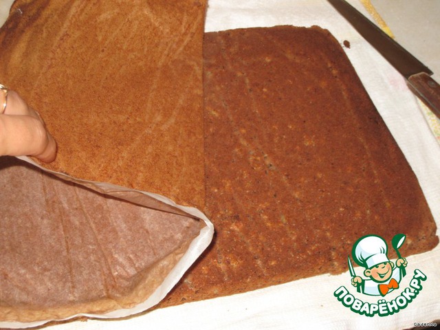 Готовое тесто перевернуть на полотенце бумагой кверху, снять аккуратно бумагу. Сначала лучше бумагу отделить по краям по всему периметру, так будет лучше, чтобы потом при снимании не вырвать кусок тесте вместе с прилипшей по краям бумагой.