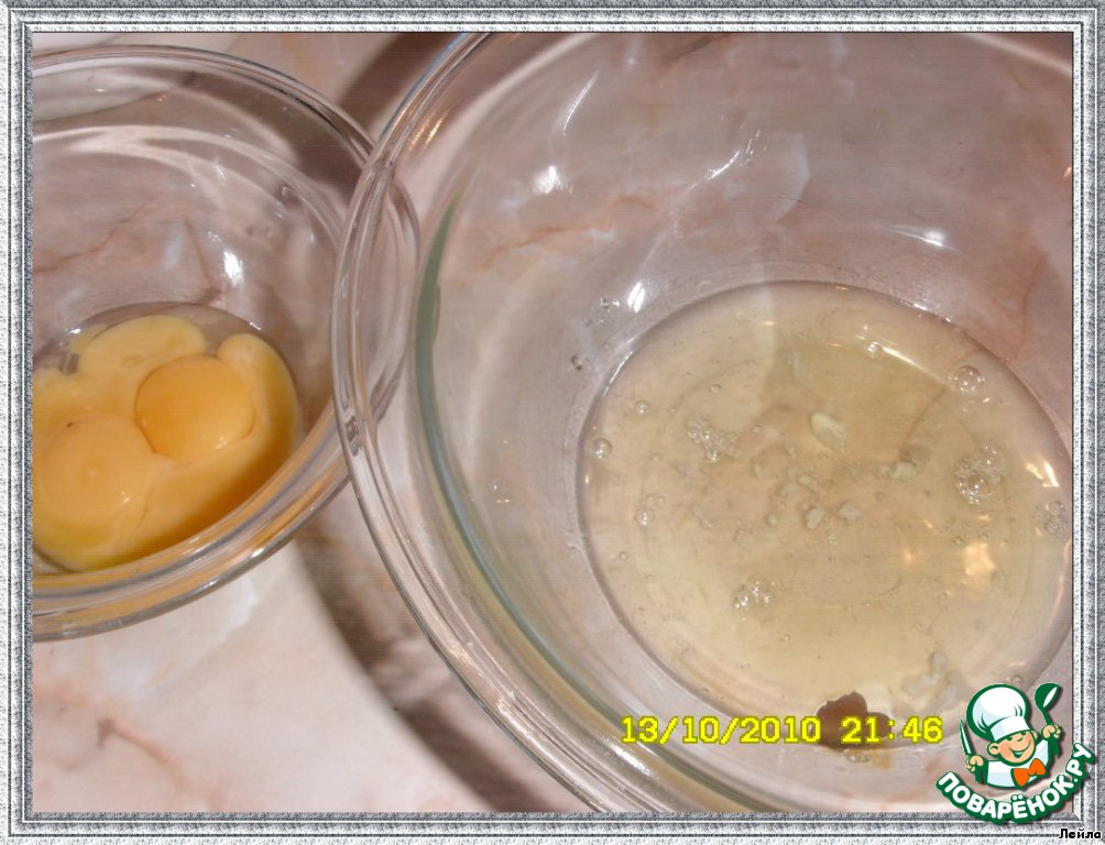 Белки с щепоткой солью взбить в тугую пену. Продолжая непрерывно взбивать, добавить постепенно сахар,
