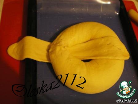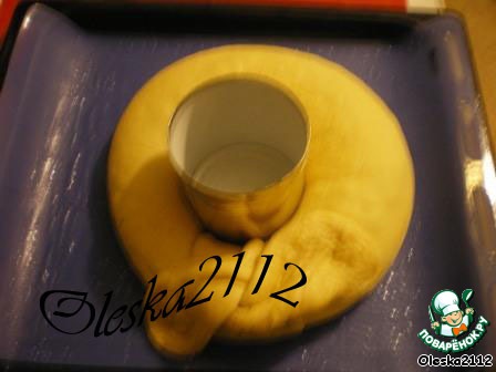 Выкладываем рулет кольцом (венком) на смазанный маслом противень или на силиконовый коврик для выпечки (как у меня). Концы рулета соединяем в кольцо, смазав яичным белком.
