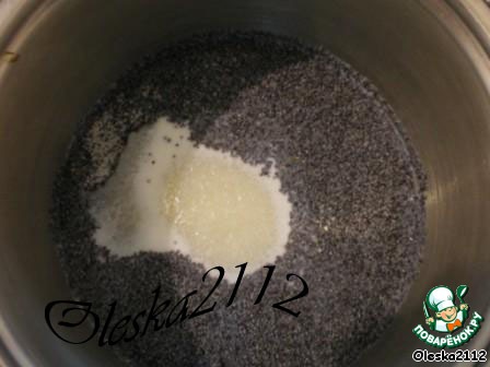 Мак всыпаем в кастрюльку, заливаем молоком, добавляем сахар и ставим на огонь. Провариваем до загустения и охлаждаем.