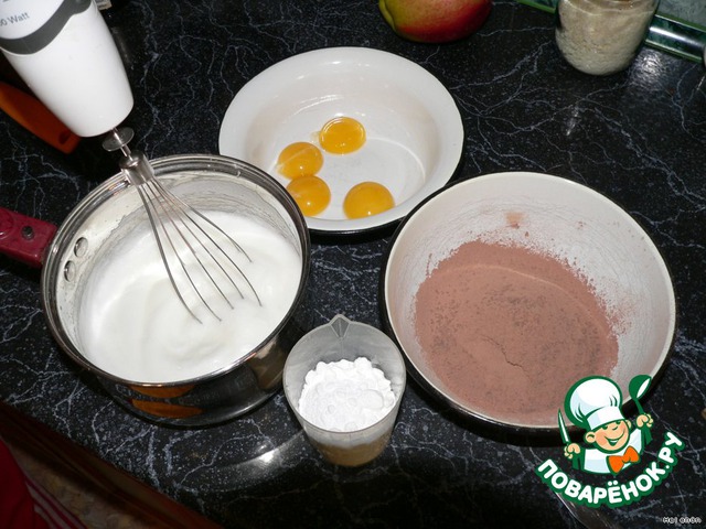Духовку прогреть до температуры 220 град. Противень выстелить пекарской бумагой. Я ничем не смазывала, но все зависит от качества бумаги. Муку, какао, разрыхлитель и 2 чайные ложки кофе смешать и несколько раз просеять. Белки отделить от желтков и взбить до крепкой пены. Добавить сахар или сахарную пудру в несколько приемов и взбить. Отдельно слегка взбить желтки.