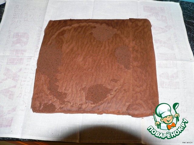 Пока корж печется, расстелить на столе лист пекарской бумаги или чистую салфетку, слегка равномерно присыпать сахаром (совсем немного). Готовый корж аккуратно перевернуть на подготовленную бумагу и накрыть влажной салфеткой на 1 мин. Потом осторожно снять бумагу, на которой корж пекся.