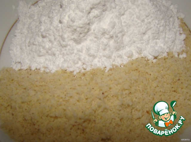 Перемешайте молотый миндаль с 60 гр сахарной пудры(или сахаром)..+ Одно целое яйцо и 2 желтка