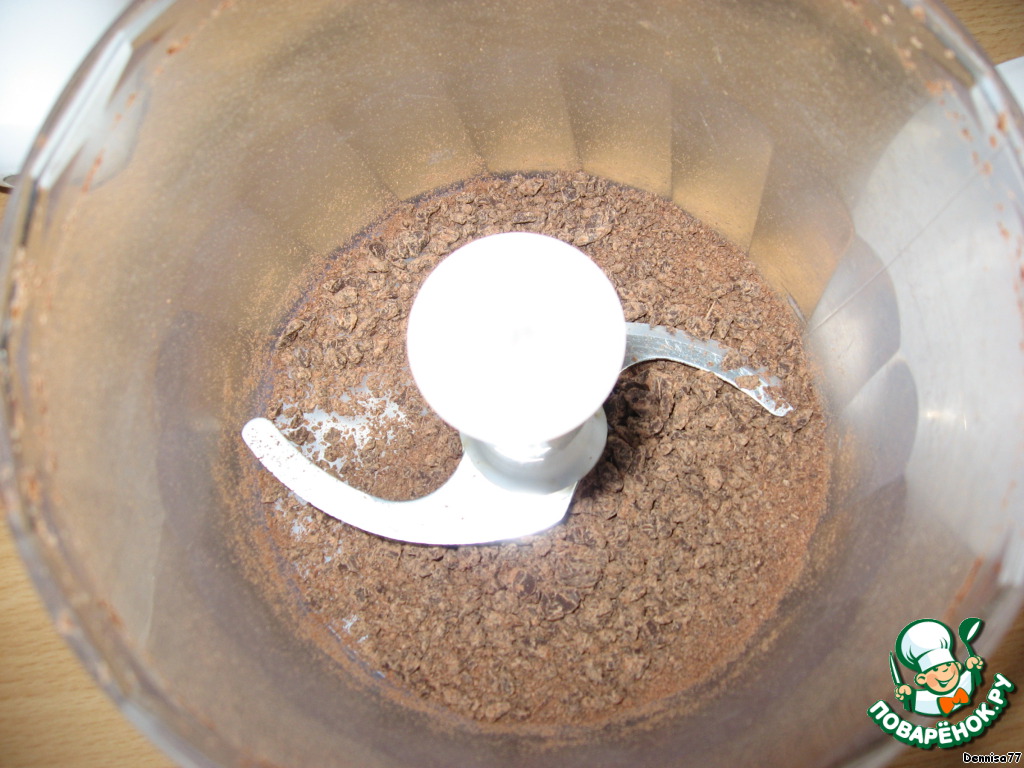 Оставшийся шоколад, то есть 50 грамм, размолем блендером на мелкие кусочки или можно настругать ножом.
