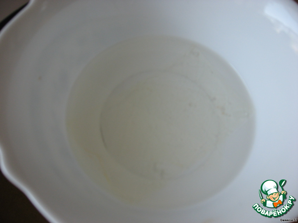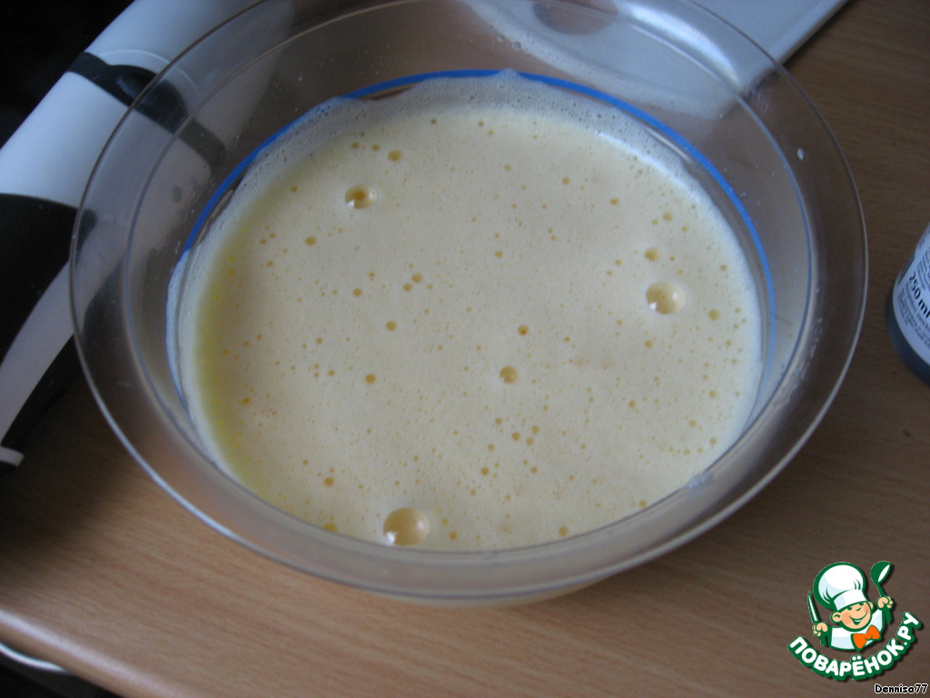 Яйца, сахар и воду взбиваем миксером в течение 8 минут и добиваемся пенистого состояния.
