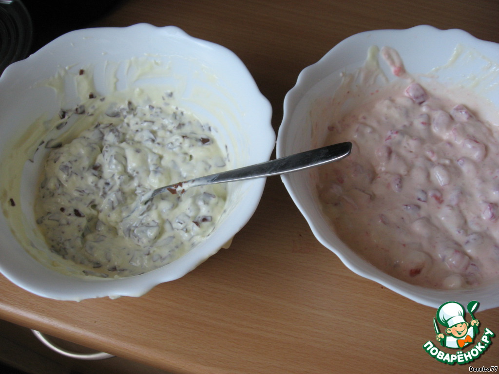 Делим наш крем на две части. В одну добавляем клубнику, в другую - шоколадную стружку.