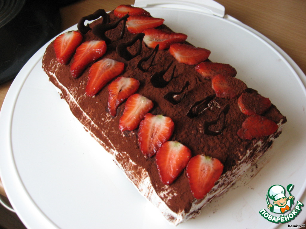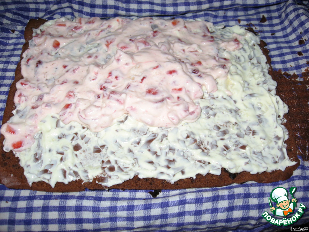 Итак, покрываем наш бисквит сначала шоколадным кремом, затем клубничным.
