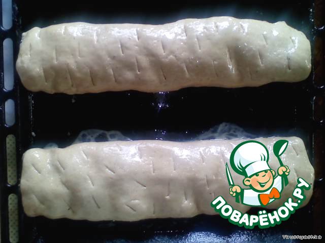 Выкладываем рулетик на противень. Смазываем его сверху яйцом и делаем надрезики ножом, иначе он растрескается. Сверху можно присыпать корицей. Ставим в духовку и выпекаем при температуре 200 градусов до 40 минут