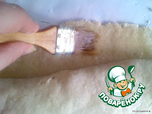 Сворачиваем рулетик. Т.к. тесто достаточно сухое, смажем его край взбитым яйцом, чтобы оно не расклелилось и не вытекла начинка.