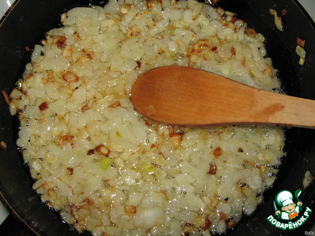Нарезанный кубиками лук жарим до золотистого цвета.
