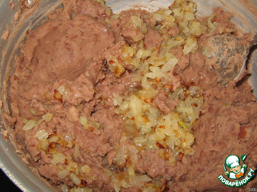 На бекон выкладываем фасолевое пюре и разравниваем.