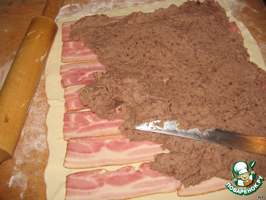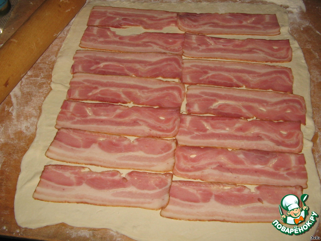 Тесто раскатываем прямоугольником, выкладываем на него полоски бекона.
