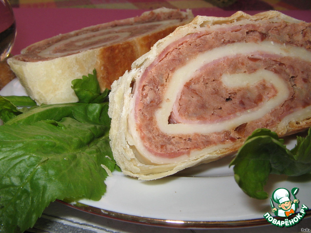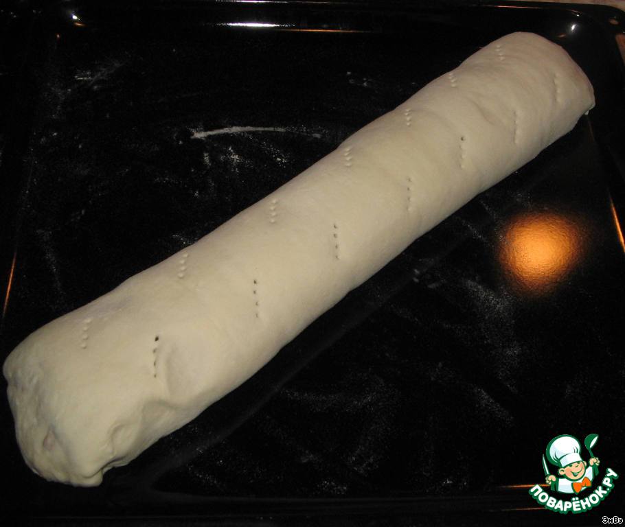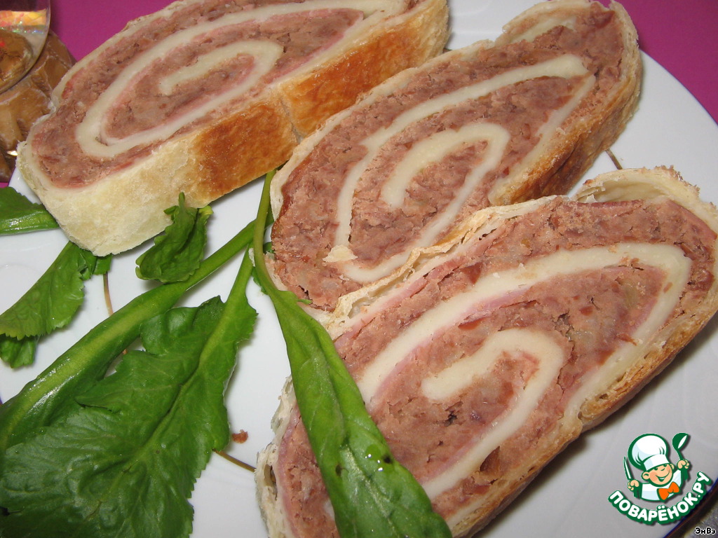 Сворачиваем рулет, выкладываем на противень и ставим в разогретую духовку. Печем при t 180* 40-45 минут. За 5 мин до готовности смазываем смесью желтка с молоком и переводим на верхний огонь (при наличии такового, разумеется).