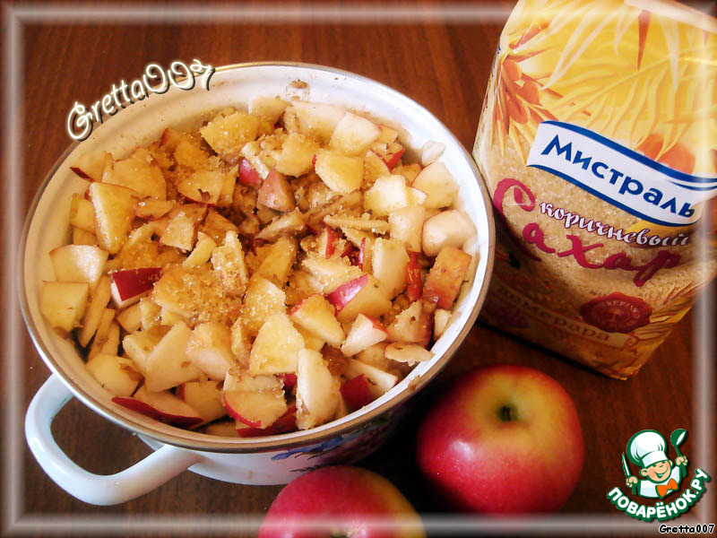 Яблоки и сахар для начинки. Их количество нужно взять по своему вкусу. В рецепте указано то, что по вкусу мне. Сахар лучше взять коричневый, крупный или мелкий - всё равно. Здесь главное - аромат.