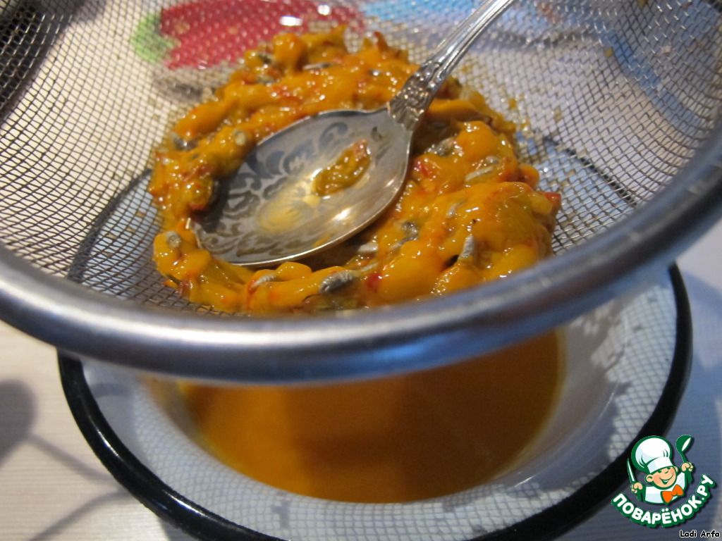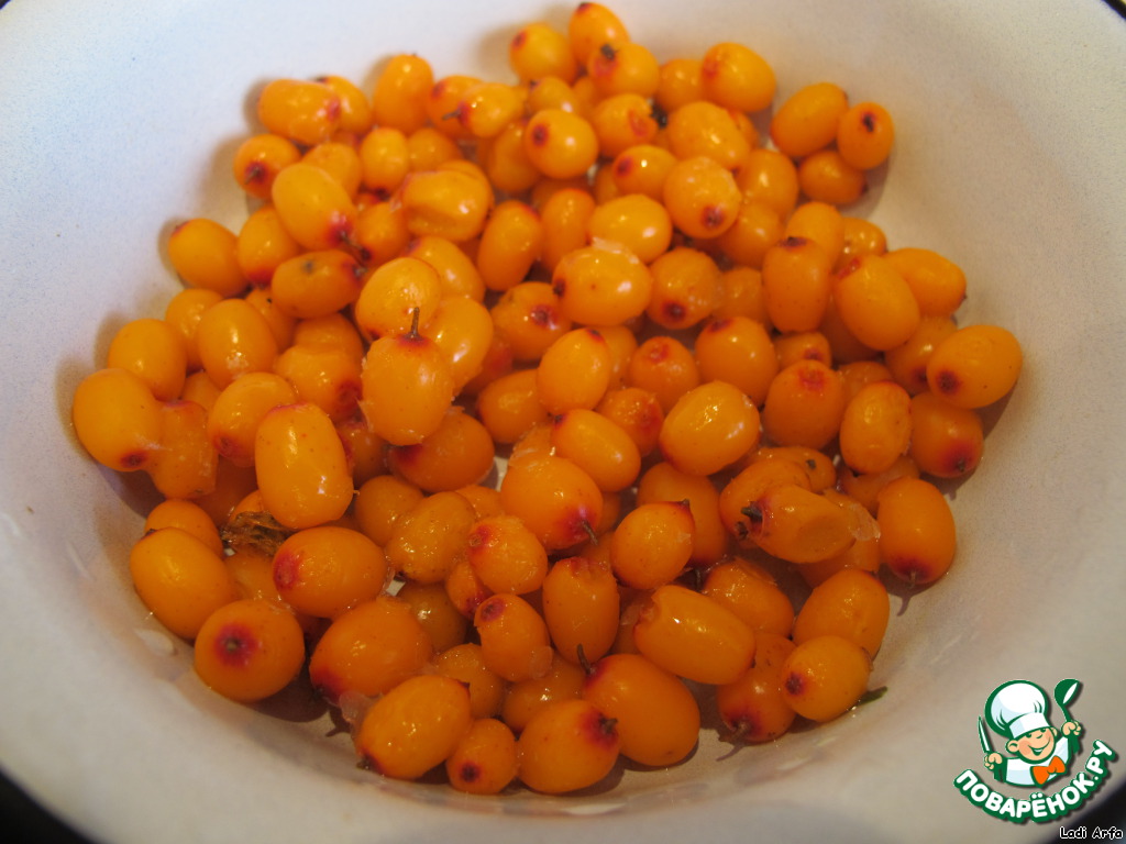 Залила ягоду кипятком, дала постоять минут 10. Слила воду и тихонько размяла, так как ягода имеет очень яркий цвет и при попадании на одежду оставит о себе на долгую память оранжевые пятнышки.