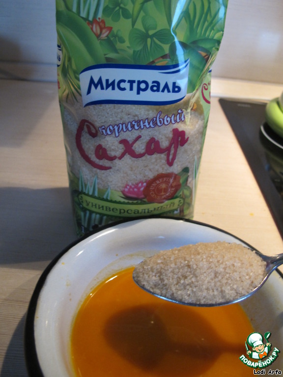 Желтки растираем с 0,5 ст.л. коричневого сахара.