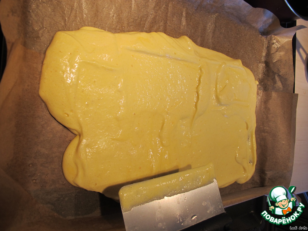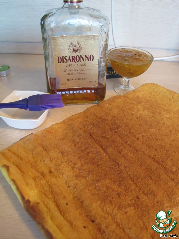 Методом сворачивания снимаем с бумаги. Разворачиваем, пропитываем Амаретто и смазываем джемом (у меня апельсиновый с киви).