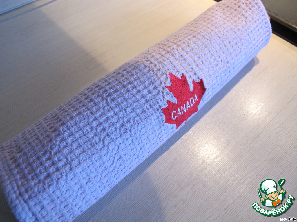 После выпечки бисквит перекладываем на полотенце и сворачиваем. Даём остыть.