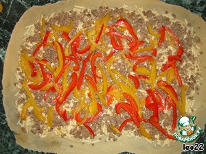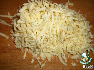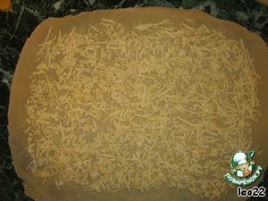 Выкладываем начинку, отступая от края на 3 см. Сначала тёртый сыр.