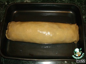 Аккуратно сворачиваем рулет и выкладываем его в смазанную маслом форму швом вниз. Сверху смазываем яйцом.