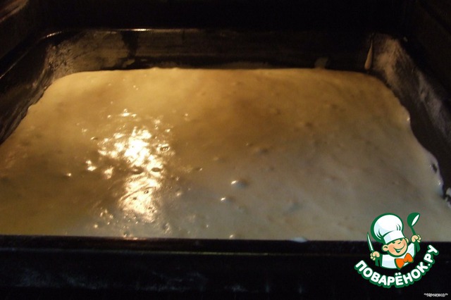 Теперь нужно смазать противень маргарином, посыпать мукой, и выложить ровным слоем тесто.