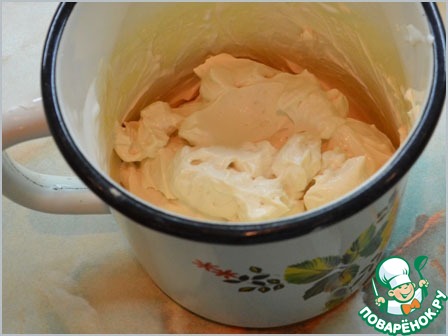 Пока остывает бисквит, займемся кремом. Взбиваем хорошо охлажденные сливки. (Я ставлю сливки, уже в емкости для взбивания, на несколько минут в морозилку. Взбиваются быстро). К концу взбивания подсыпаем сахарную пудру (по вкусу) и добавляем несколько капель ванильной эссенции или ванилин (по вкусу). Во взбитые сливки вмешиваем наш домашний крим-чиз. Проследите, что бы в нем полностью отсутствовала сыворотка.