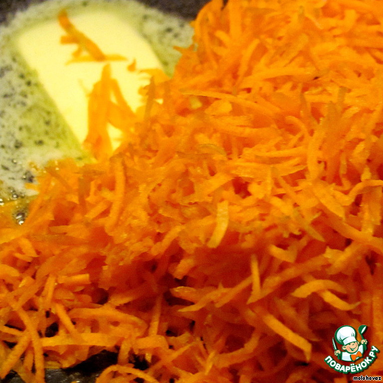Морковь натереть как можно мельче (у меня чуть крупновато). Потушить пару минут на сливочном масле. Добавить мед и еще потушить.