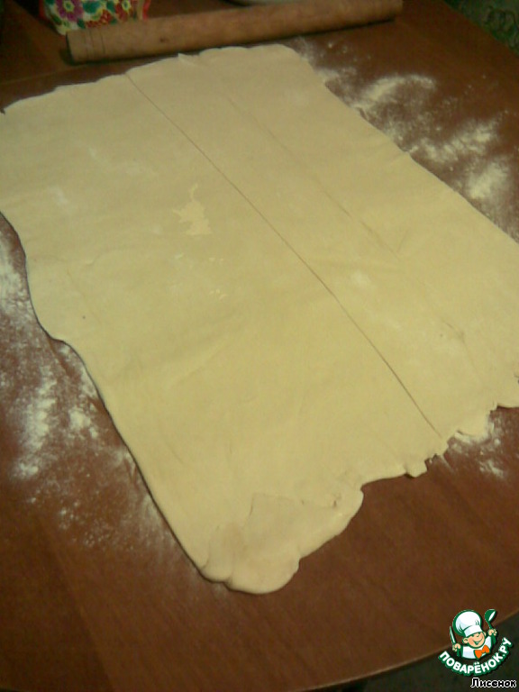 Тесто раскатать прямоугольником и разрезать на 2 одинаковые половины.