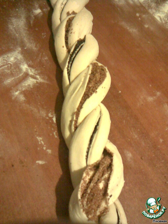 На одну полоску теста выложить ореховую начинку, скрутить рулетом.