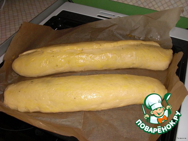 Смазать рулет желтком, дать постоять 20-30 минут, чтобы тесто чуть поднялось.