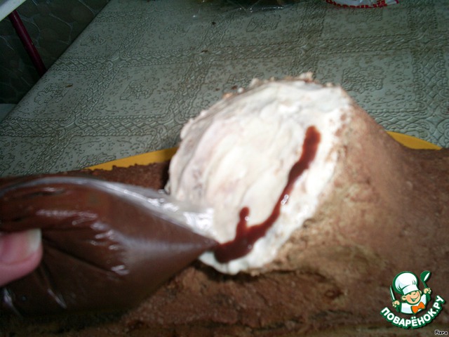 Рулет смазываем кремом, оставляя 1/4 часть крема, чтобы покрыть срез.