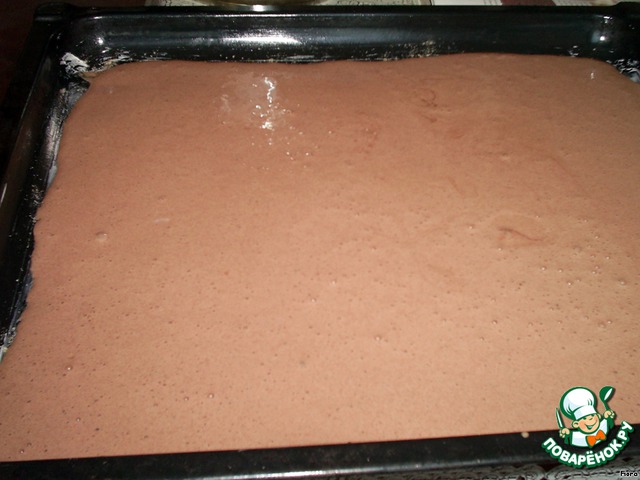 Взбиваем яйца с сахаром до пышной пены, добавляем просеянную муку, 0,5 ч.л. разрыхлителя и 3 ст.л. какао.