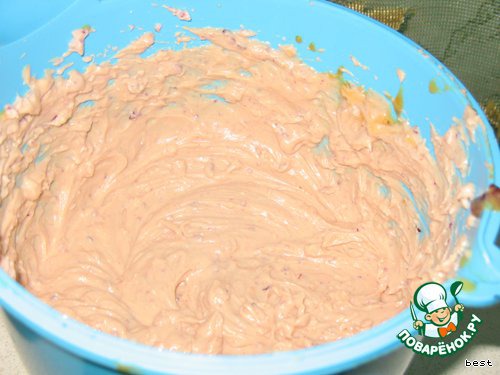 Творог взбить со сметаной. Не прекращая взбивать, по одной ложке добавлять вареную сгущенку, влить эссенцию, взбивать до однородной, гладкой массы.