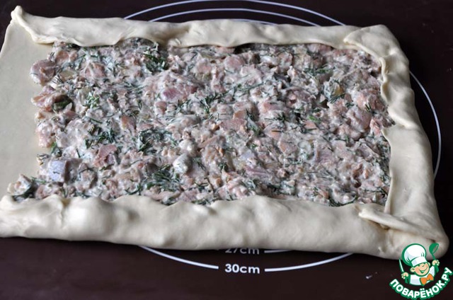Кладём на тесто начинку, разравниваем, оставляя приблизительно по 3 см от всех краёв.