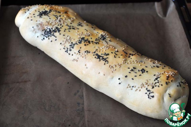 Кладём рулет швом вниз на противень, покрытый пекарской бумагой.