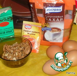 Яйца взбить с сахаром в пену. Добавить размолотые орехи, муку, какао и разрыхлитель, перемешать