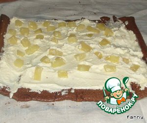Рулет развернуть, снять бумагу, равномерно нанести крем, разложить ананасы, снова свернуть, Оставить остывать на час.