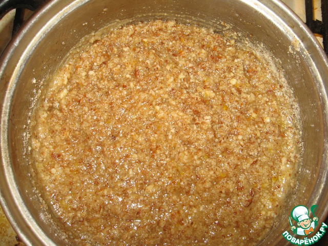 Добавить 50 гр. сливочного масла и цедру 1/4 лимона и варить на медленном огне 5 минут. Засыпать молотые орехи и варить еще 5 минут. Снять с огня и влить бренди. Полностью остудить.