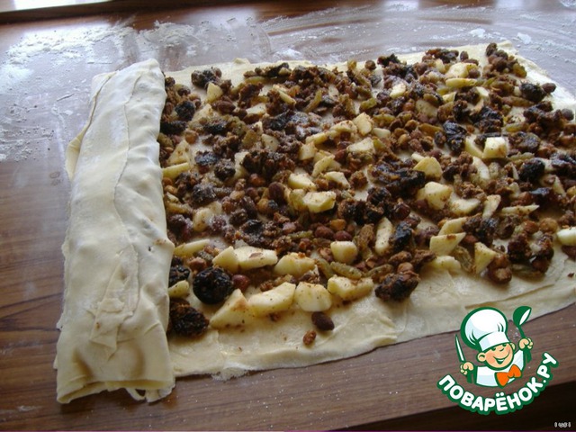 Листы слоеного теста, уложенные внахлест, хорошо смазанные растопленным маслом, покрытые начинкой, завернуть в рулет.