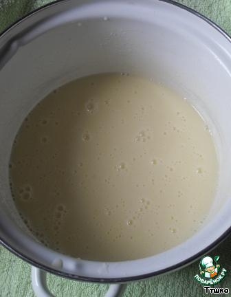 1 стакан молока доводим до кипения и вливаем в массу с желтками. Перемешиваем и доводим до кипения, постоянно помешивая. Остужаем.